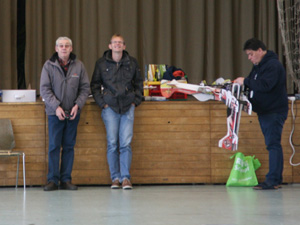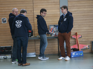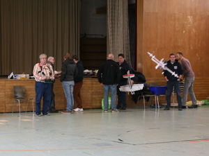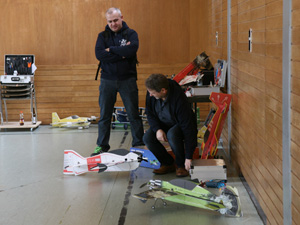 Die Vorhut der 8 Piloten stand pünktlich um 10 Uhr auf der Matte oder besser vor der Halle und packte aus und packte aus und packten aus. Ich glaube, so viele und vor allem so große Modelle hatte die Halle noch nicht gesehen.