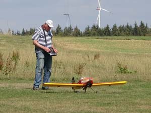 Wir führen bei uns einen Meisterschaftslauf in der Klasse F2B - Fessel - Kunstflug durch. Wir erwarten hier die besten Piloten aus Deutschland, keine Angst, ich rede von vielleicht 10 Teilnehmern. Kunstflugmodelle sind heute i.d.R. mit Elektromotoren ausgerüstet (ansonsten 10ccm Methanoler), haben eine Spannweite von ca. 1600mm und fliegen 16 Figuren in einer vorgegebenen Reihenfolge an einer ca. 20m langen Leine. Noch Fragen? Dann merkt Euch den 19. und 20.August 2023 vor.