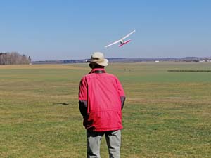 Linni hatte zum ersten Mal in seinem Leben einen Griff in der Hand und so passierte etwas mit Seltenheitswert, ich durfte einen von Linni gebauten Flieger mit ausdrücklicher Genehmigung des Meisters dem Jungfernflug zuführen.