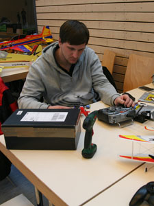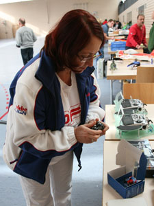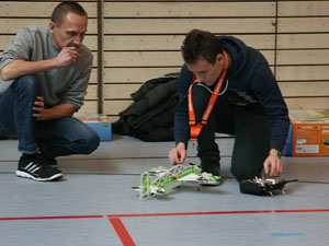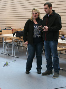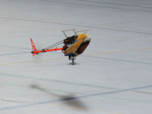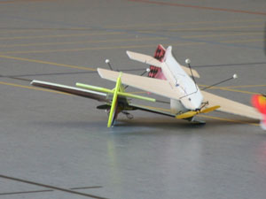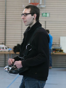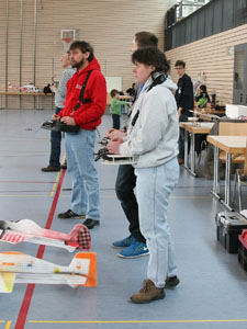Sobald zwei oder mehr Modelle in der Luft sind, treffen sie sich in einem Punkt. Würde man hier Wahrscheinlichkeitsbetrachtungen anstellen und fragen, wie hoch die Wahrscheinlichkeit ist, dass sich ein Mikroquadrocopter und ein Mikroheli zufällig in der Halle treffen, wäre man bei Wahrscheinlichkeitswerten eines Lottogewinns. Irgend wie kann die Mathematik nicht stimmen, sagt mir mein Bauchgefühl, denn es vergehen keine 10 Minuten, ohne dass es scheppert. Da sich aber die Schäden in der Regel in Grenzen halten, haben sowohl Piloten als auch Zuschauer ihren Spaß daran ! Ich frage mich nur, warum machen die nicht gleich ein Schwänzchen dran und spielen Air-Combat ! Aber dann treffen sie sich vielleicht nicht mehr ?!