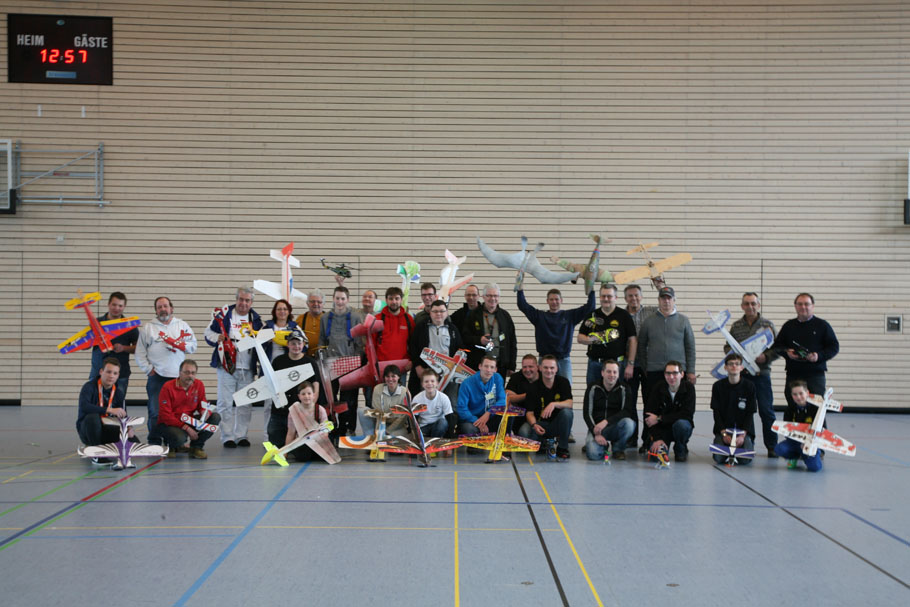 Am Sonntag standen wir erwartungsvoll um 9.00 Uhr vor der Halle, am Vormittag flogen wir nochmal zur Modellabstimmung, dann Mittagessen, Pilotenbriefing und 13.00 Gruppenfoto.